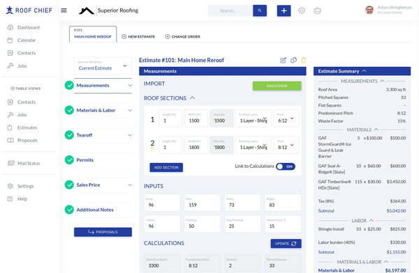 Automated Workflow: All the tools Rooflink has to offer are all connected with each other, allowing roofers to go from making estimates to ordering materials with one click.