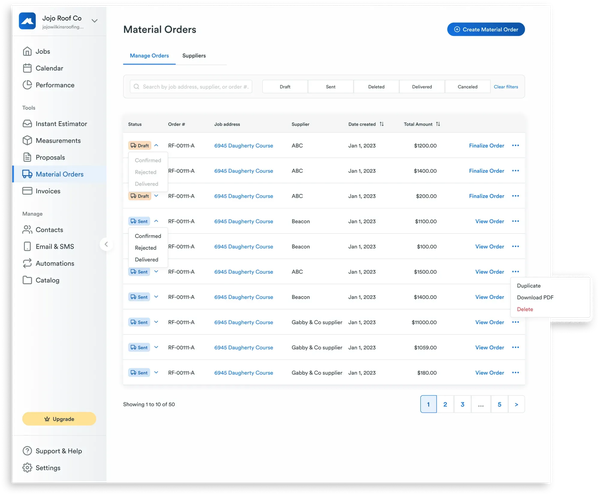 Material Orders: Roofr helps get rid of the risk of incorrect orders by automatically creating roofing material orders from roofing proposals, keeping the material types and amount consistent. Roofers can also submit material orders to preferred suppliers directly from Roofr.