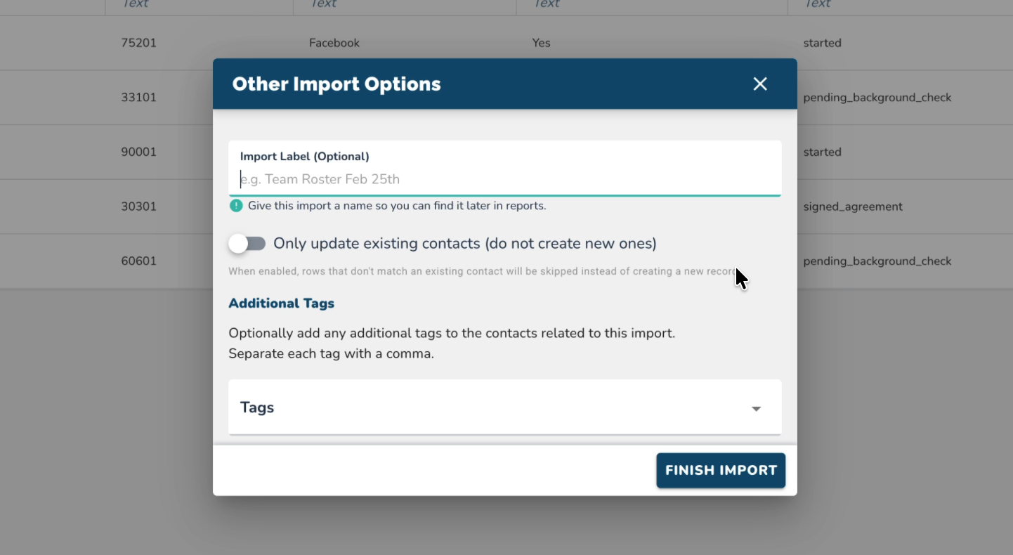 b. Toggle Button to "Only update existing contacts"c. Add a tag (default is "import_" followed by the date)