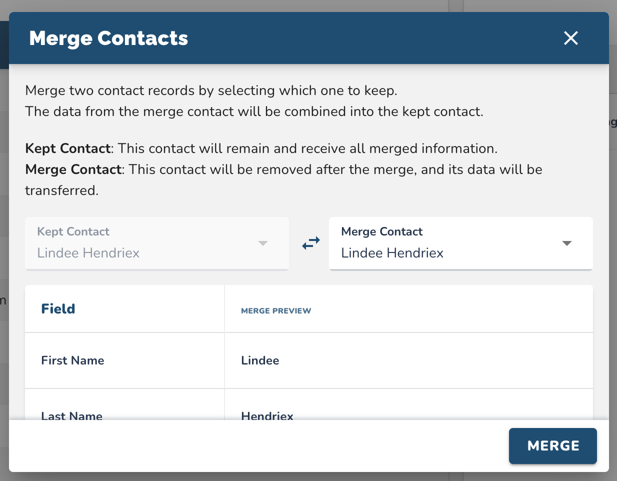 If Contact A (Kept) has a phone number and Contact B (Merge) does not, the phone number will remain. If Contact B has a company name and Contact A does not, that company name will be added to Contact A’s record.