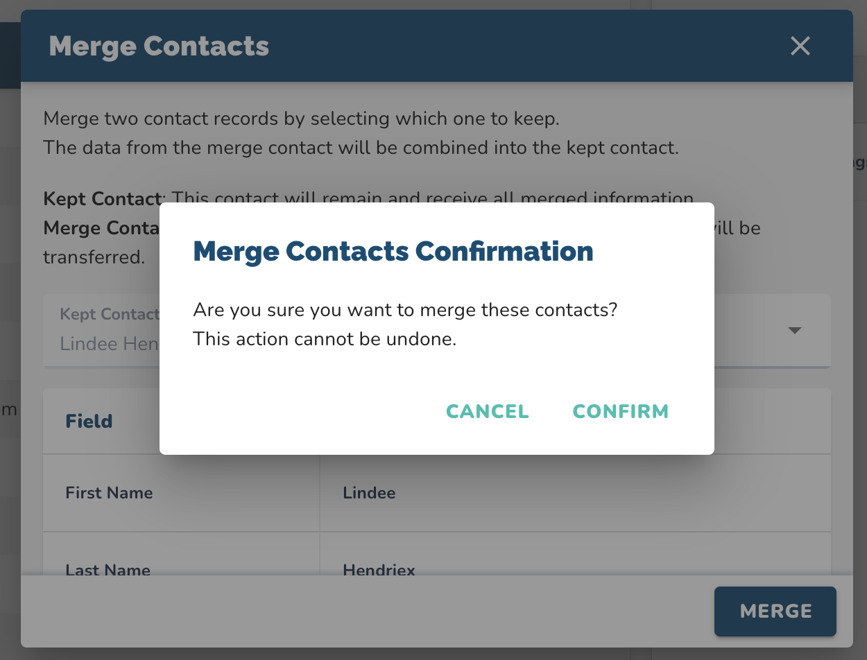 Merge Contact: This record will be removed after the merge. Any data it contains will be transferred to the Kept Contact.
