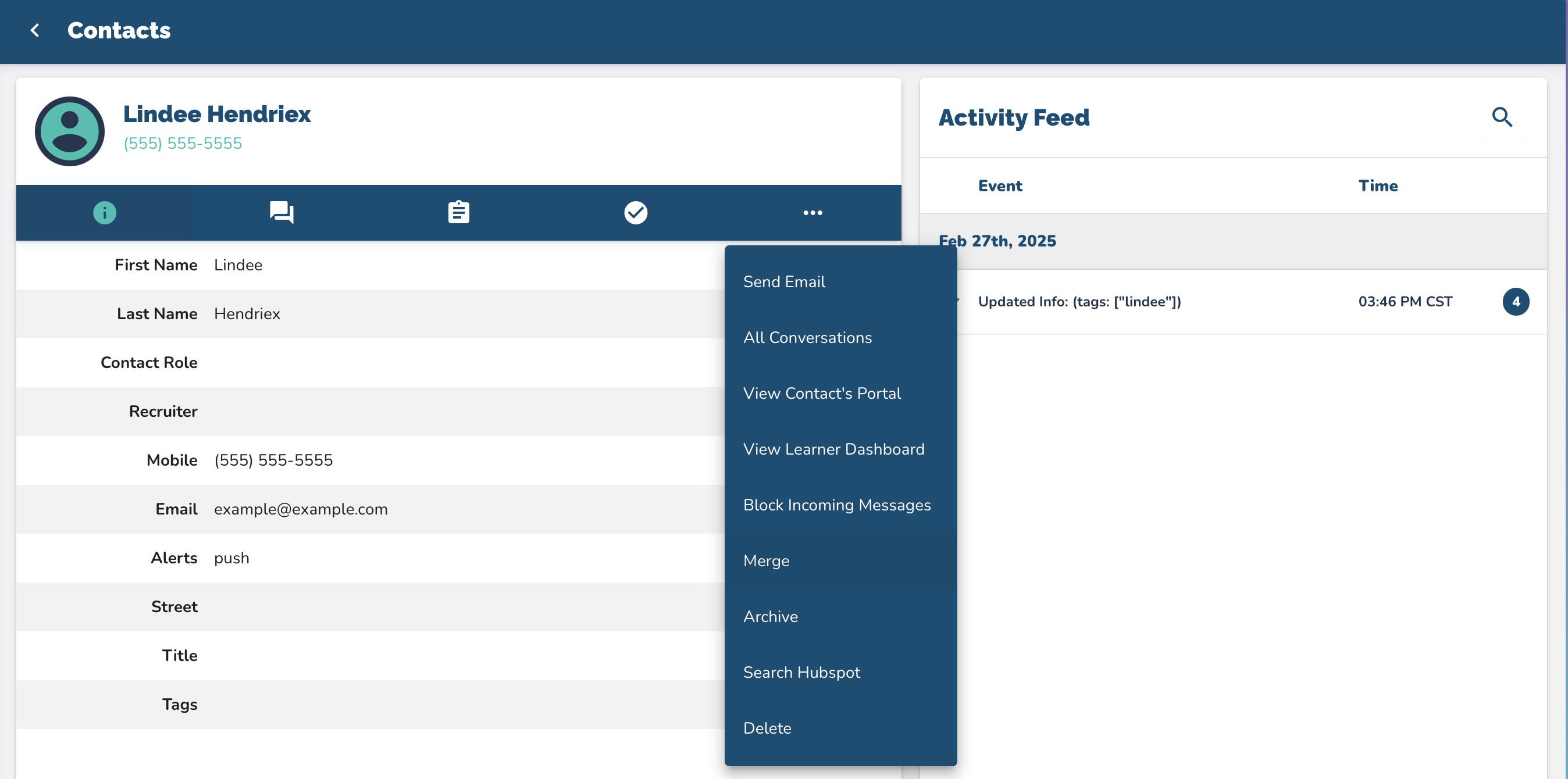 Click on the three dots in the top right corner of their profile to open the Contact Actions dropdown menu.Select Merge